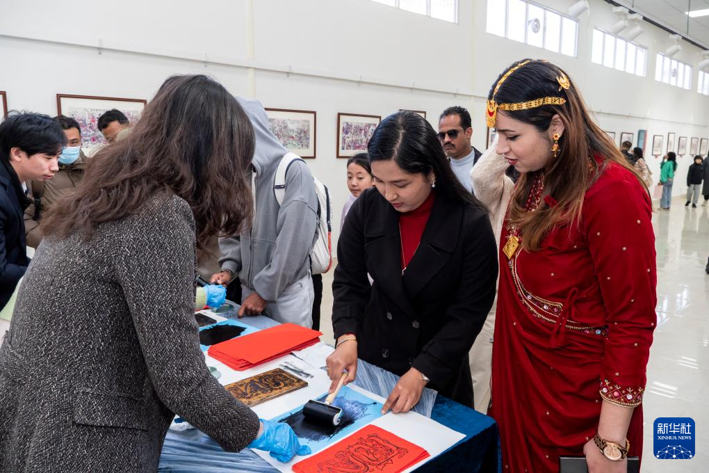 1月24日,在尼泊尔首都加德满都,观众在年画展上体验木版年画制作。新华社发(哈里·马哈尔詹摄)